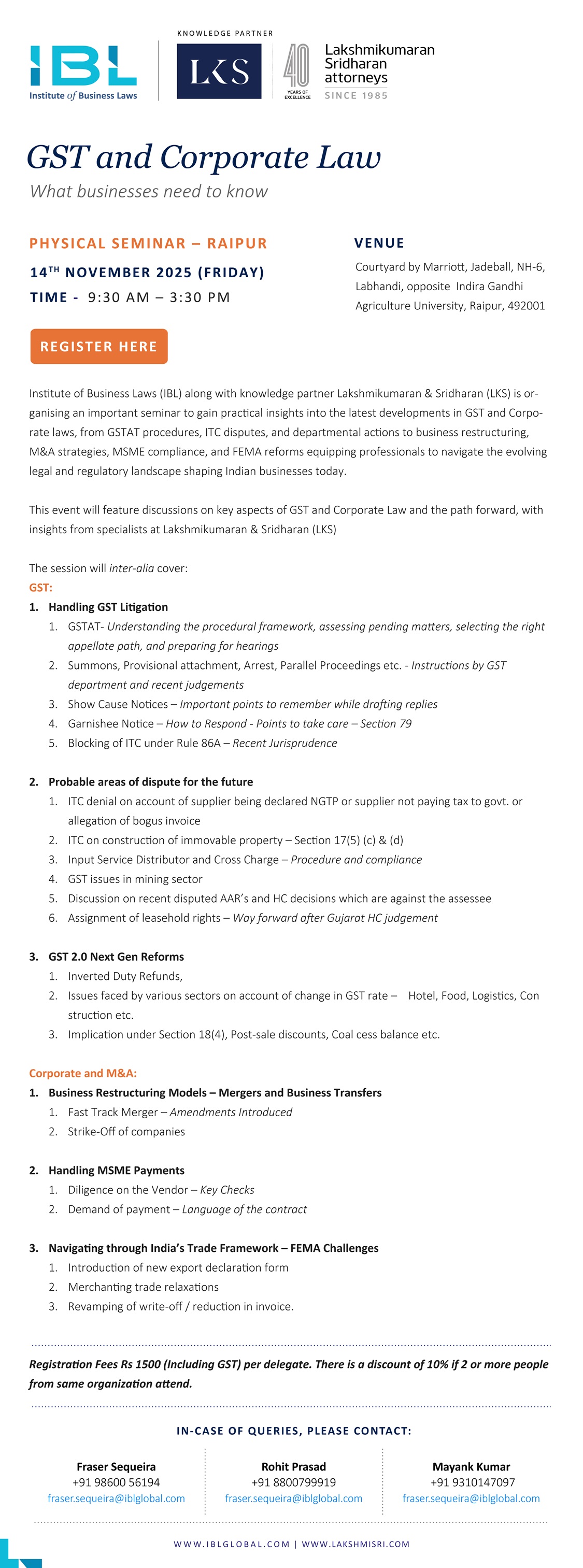 Disclaimer : Contents displayed in this website are copyright of Institute of Business Laws (IBL). Reproduction, duplication or transmission of information available in this website without prior permission is strictly prohibited. Dates and locations of seminars are subject to change depending on availability of speakers/venue. All rights reserved.