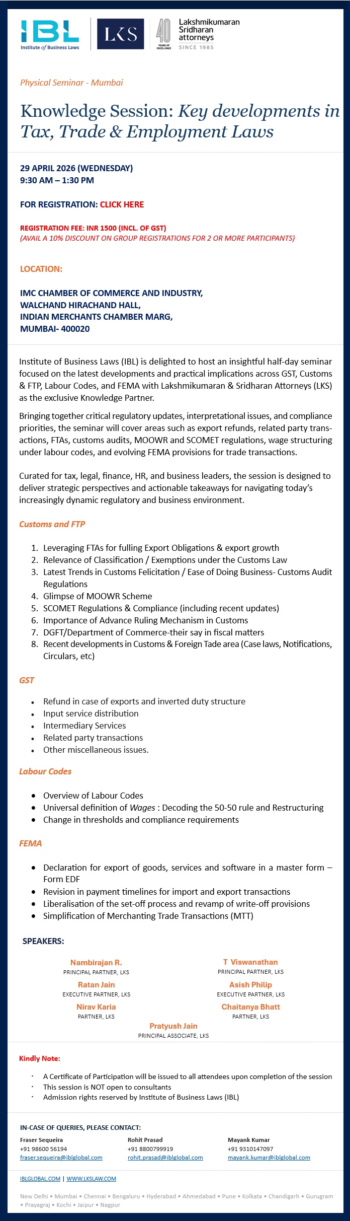Disclaimer : Contents displayed in this website are copyright of Institute of Business Laws (IBL). Reproduction, duplication or transmission of information available in this website without prior permission is strictly prohibited. Dates and locations of seminars are subject to change depending on availability of speakers/venue. All rights reserved.
